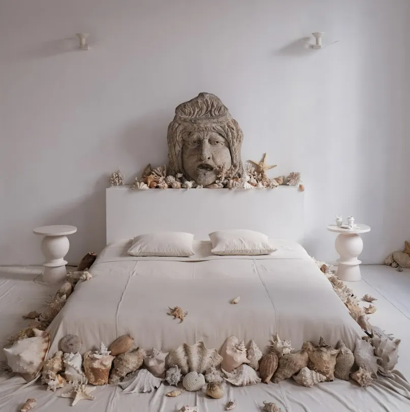 À Nice, elle a récemment conçu la scénographie de la suite à l’étage de la boutique Trésors Publics, un écrin transformé en sanctuaire marin : un lit immaculé couronné d’un visage antique et entouré d’une constellation de coquillages en céramiques, véritable autel mythologique dédié à la mer et à la beauté infinie. Léa y avait dessiné appliques, suspensions, pots et pique-fleurs en édition limitée, d’une poésie antique et moderne sculpturale.